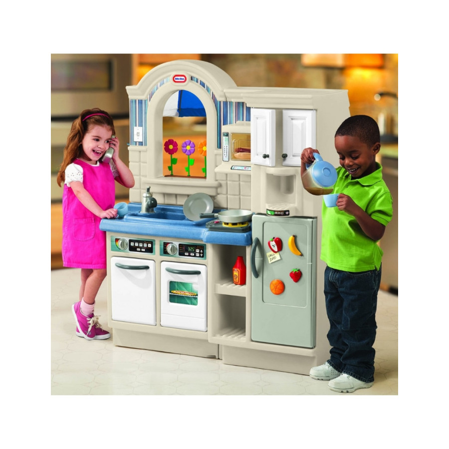 Due ambienti di gioco in uno: cucina da interni o barbecue da giardino. La cucina include una caffettiera, porta del frigo magnetica e piano di cottura che riproduce i suoni elettronici. Una finestra, uno spazioso lavello con rubinetto, forno , lavastoviglie e contenitori. L'ambiente esterno è altrettanto realistico: pavimentazione, tenda parasole in tessuto, tavolo da picnic. Il grill produce suoni caratteristici e "fiamme" realistiche.