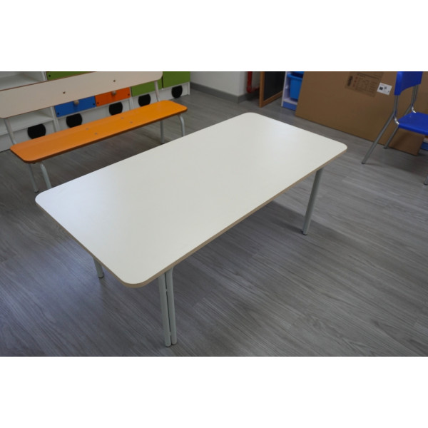 Banco refettorio con gambe in metallo verniciato. Piano in legno aggregato con spessore mm 18. Bordatura del piano in gomma con spigoli arrotondati per la sicurezza dei bambini.