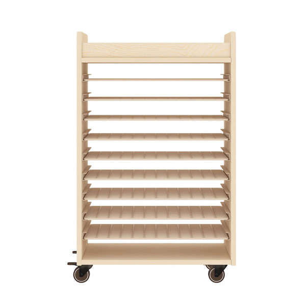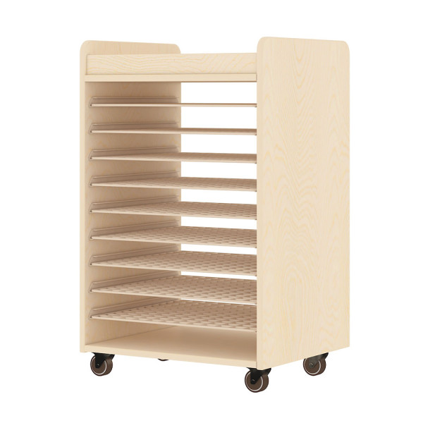 Mobile carrello versatile e funzionale, progettato con ampi ripiani per offrire spazio e praticità nell’organizzazione di fogli da asciugare dopo l'attivitò di laboratorio. La struttura compatta ma capiente lo rende ideale per ambienti scolastici, ludici o domestici, facilitando lo spostamento grazie al design maneggevole.