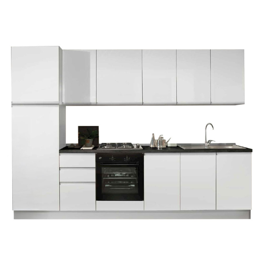 Cucina basic 300 WHITE con colonna completa di lavello 2 vasche, piano cottura da 60, forno statico e frigorifero.