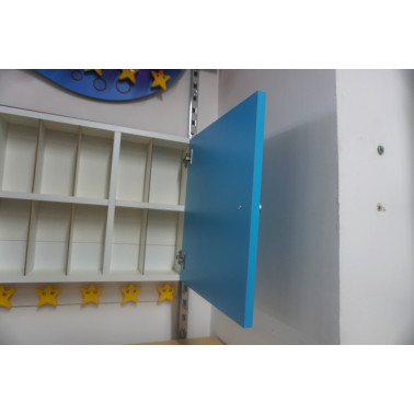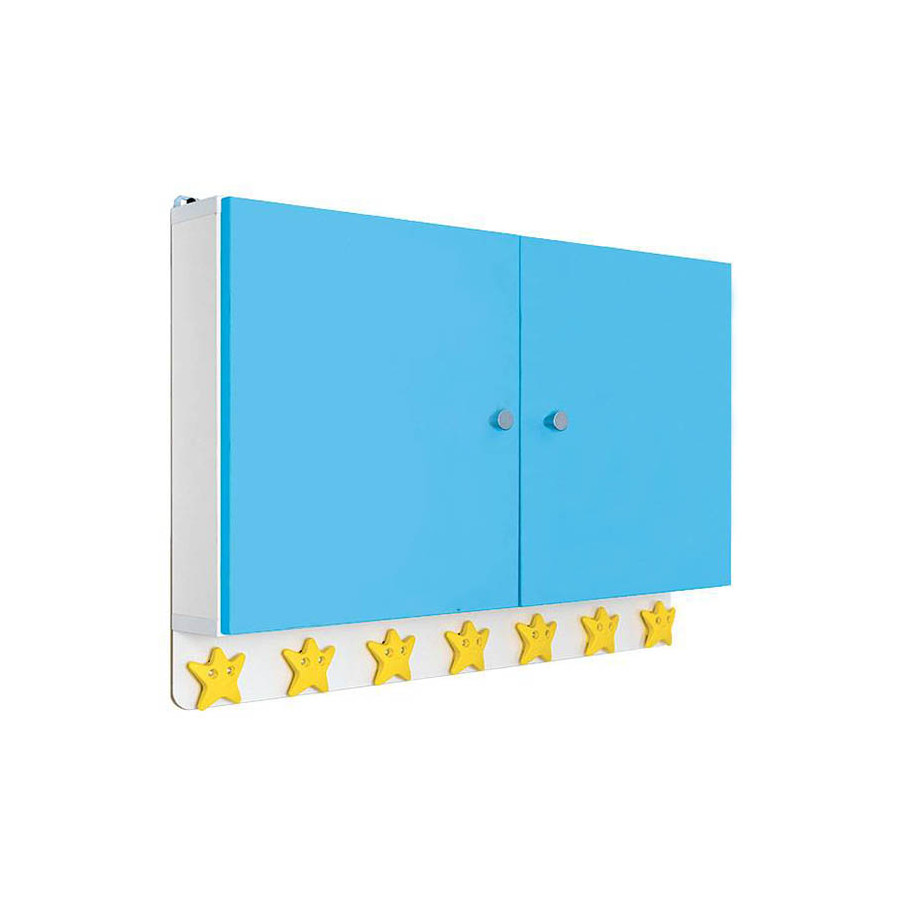Il mobile pensile portaspazzolini con appendini è la soluzione ideale per riporre in modo igienico i bicchieri degli spazzolini da denti e gli asciugamani nelle strutture scolastiche. Il mobile ospita nicchie per 14 tazze, separate da scomparti, e 7 ganci a tripla stella per appendere gli asciugamani. Le ante dei mobili sono realizzate in truciolare blu e i separatori interni sono realizzati in pannello HDF. Il tutto è dotato di maniglie in alluminio, garantendo estetica e funzionalità.