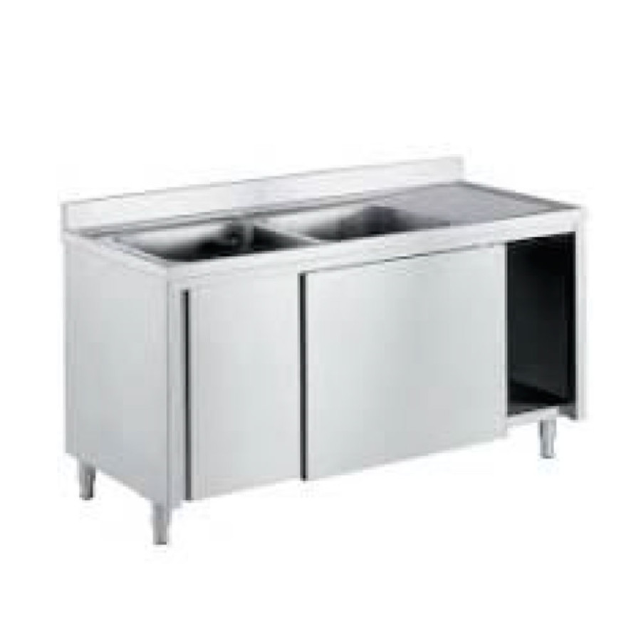 LAVELLO ARMADIATO DUE VASCHE CON SGOCCIOLATIO DX IN ACCIAO INOX 18/10 AISI 304 CM 150 X 70 X 85 (H) + CM 10 ALZATINA