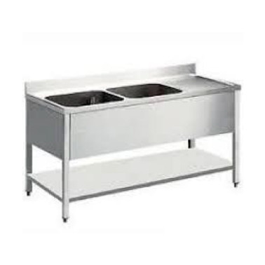 LAVELLO CON 2 VASCHE CON SGOCCIOLATOIO A DX E RIPIANO INFERIORE IN ACCIAIO INOX CRNI 18/10 AISI 304