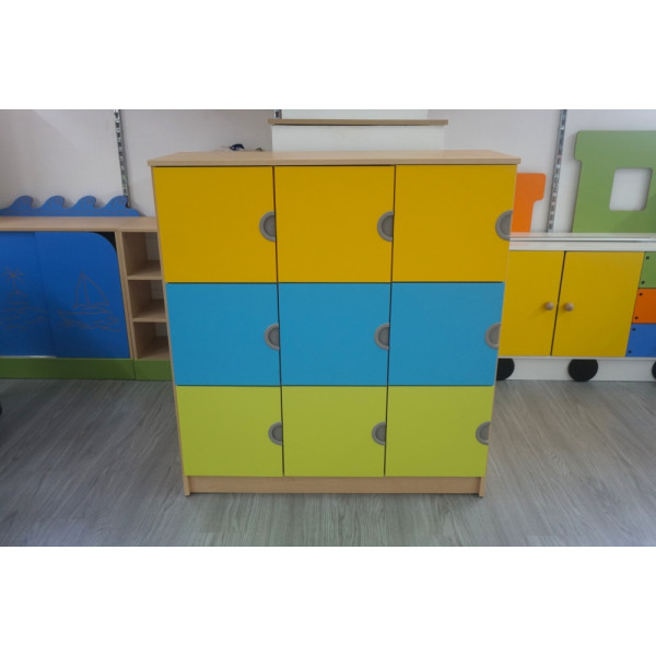 Mobile basso a 9 caselle con ante colorate. Ideale per contenere giochi, strumenti, articoli di cancelleria, colori e molto altro.