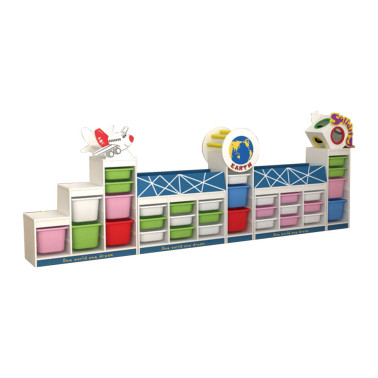 Mobile composizione giramondo composto da armadi funzionali e pratici, una moltitudine di cassetti e mensole esterne che aiutano la sistemazione di materiali didattici o giocattoli. Bellissima composizione colorata con cassetti a scorrimento di facile apertura e chiusura. Ideale per scuole, ludoteche e nidi.