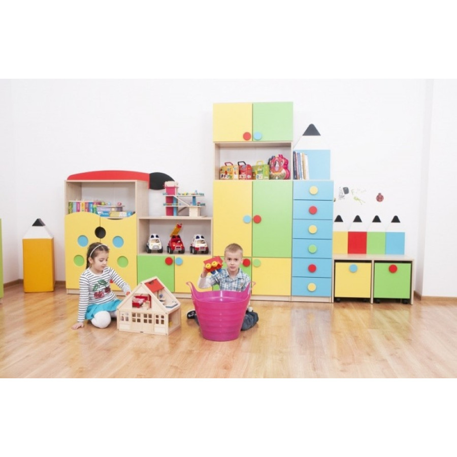 Mobile composizione Matite Colorate, composto da armadi funzionali e pratici, una moltitudine di cassetti e mensole esterne che aiutano la sistemazione di materiali didattici o giocattoli. Bellissima composizione colorata con cassetti a scorrimento di facile apertura e chiusura. Ideale per scuole, ludoteche e nidi.
