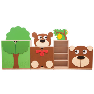 Bellissima composizione tema Orso con numerosi ripiani e porte da aprire per poter riporre oggetti e giocattoli di ogni genere. Colori pastello, angoli arrotondati e la superficie satinata confermano l'elevata qualità del prodotto. Ideale per ludoteche, scuole e nidi.