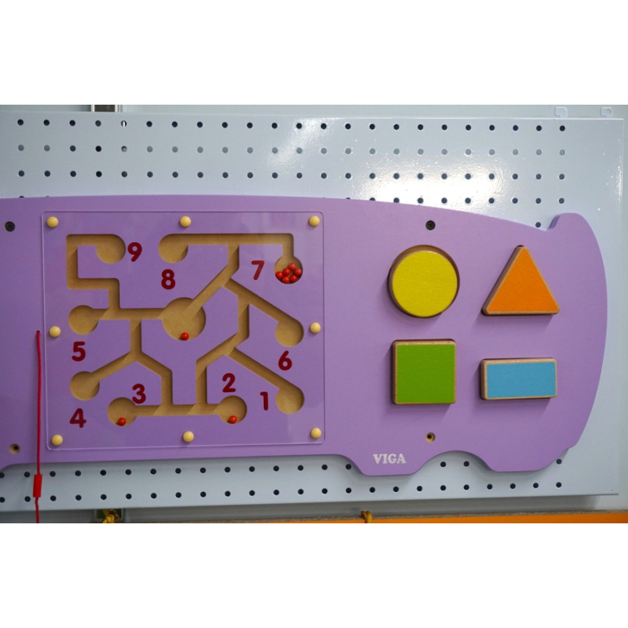 Pannello interattivo a parete in 5 pezzi, ciascuno dei quali, in modo diverso, promuove differenti capacità motorie e di coordinamento. Sui pannelli sono installati labirinti con perline, ingranaggi rotanti, campane, specchi e labirinto magnetico.