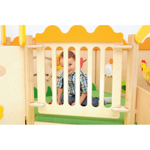 L'angolo giochi è dotato di morbidi materassi che offrono ai bambini un luogo sicuro per giocare. Ci sono scale da un lato e uno scivolo dall'altro. All'interno ci sono molte attrazioni sotto forma di elementi sensoriali.