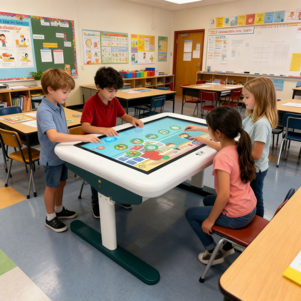 Tavolo interattivo inclinabile touch screen realizzato con base completamente arrotondata e priva di spigoli.