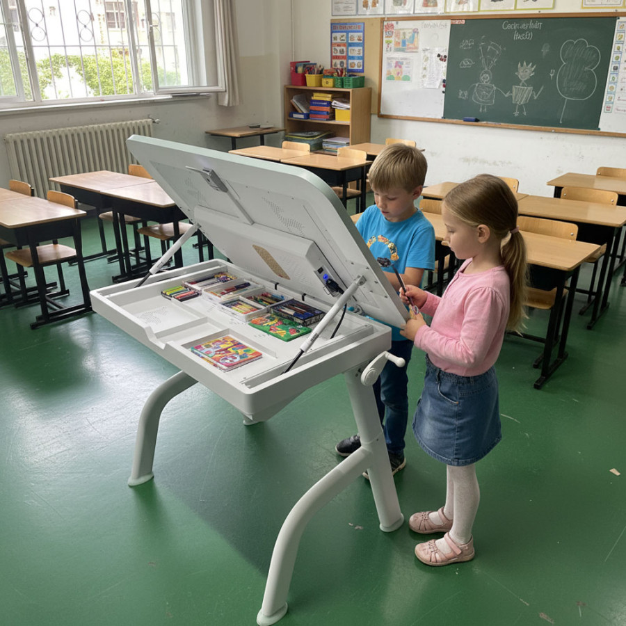 Tavolo interattivo inclinabile touch screen con vano portaoggetti realizzato con base completamente arrotondata e priva di spigoli.